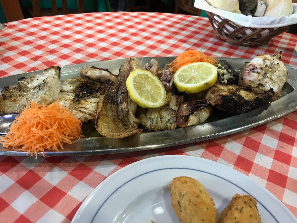This is a small sampling of lunch that came with our tour. Our guide took us to a local fresh fish restaurant. Start with a bottle of white wine,fresh crusty rolls, fish croquettes, a huge platter of fresh grilled fish, some I had no idea of what they were. Simple delicious. Whole potatoes and broccoli. All this at 2 in the afternoon. I need a nap.