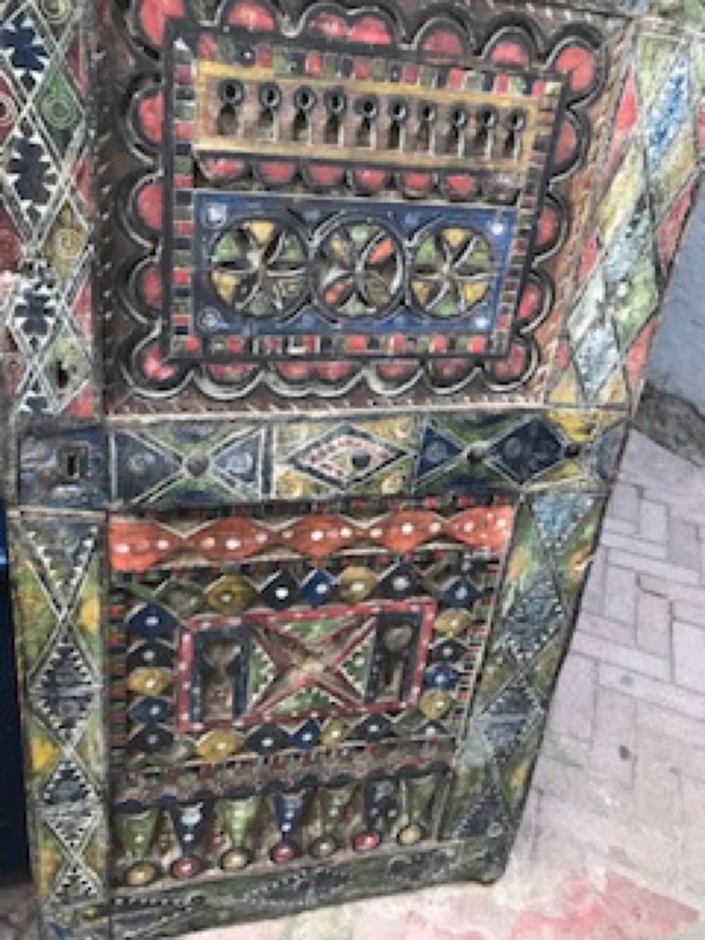 Ok I was overwhelmed today. Too much sensory stimulation I forgot to take pics of the stores. Thanks to Reid he snapped this morsel. Hand carved and painted wood cabinet. The artistry of things u can by is staggering. I loved a mirror made if camel bone. Nope not kidding amazing details. Leather everything, ceramics, inlaid chests, jewelry, shoes some handmade of rope, beyond your wildest fantasies. But not really our taste, would look odd in our house and going to be in Italy. Period going to the mecca so saving our money. But appreciated everything thing I saw. Yes bought more shoes, don’t hate me.