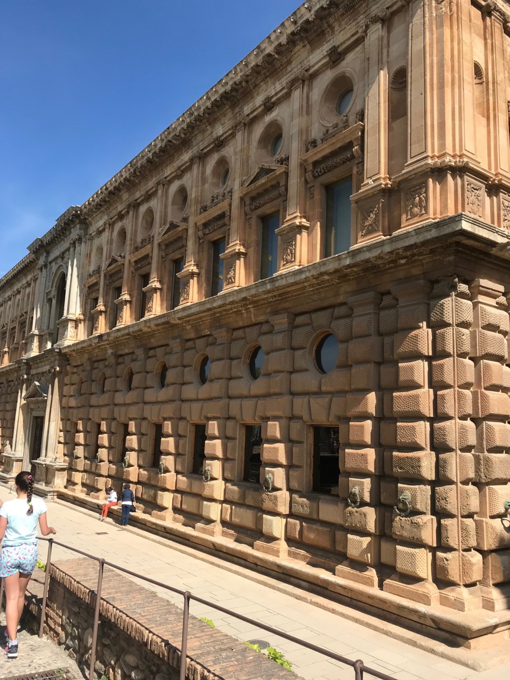 In the 1400’s the king and queen of D Spain take over Alhambra as their summer palace. Ferdinand and Isabella do some design upgrades from Moorish to a romantic, renaissance style matching the time. Again Moorish is all about what’s inside and honoring the elements of nature especially water. The king and queen want everyone to know their status so ornamental metals, swirls, decorative elements on the outside. This pic is their palace which is a museum of art, history of Alhambra.