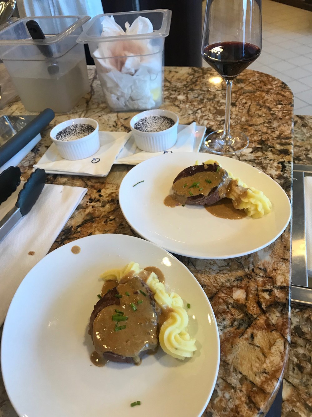 We learned how to make a proper vinaigrette for salad and how to dress it, not saturate. High pan searing of steak, very high calorie mashed potatoes. Cream, butter yup the French way. String beans with almonds. And to round it all with a pot du chocolate. Sinfully delicious, learned some techniques and had a hood time.