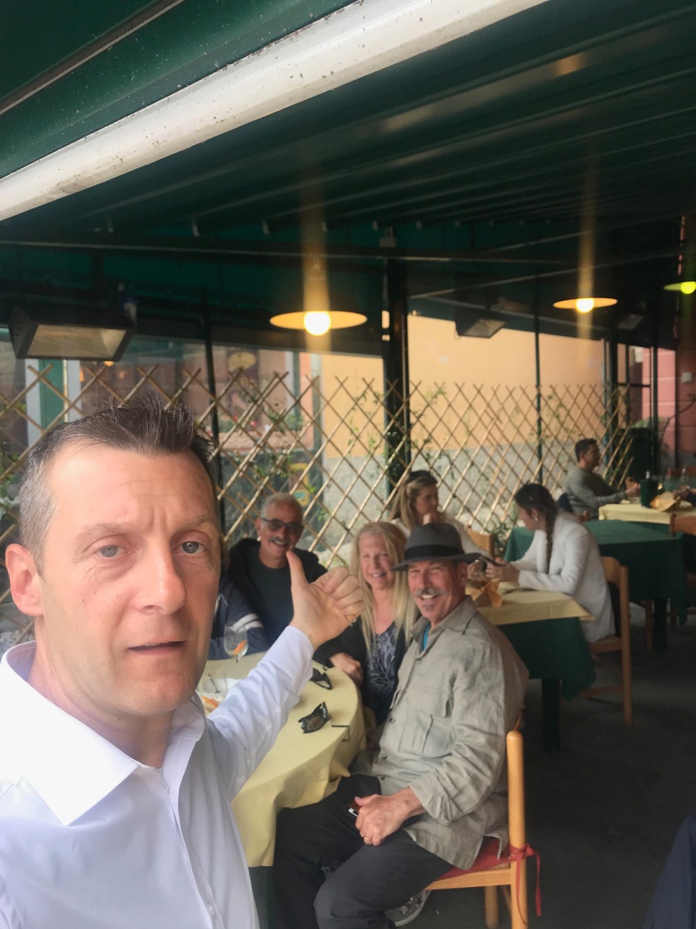 Our waiter did a selfie part of the show. My lunch pasta with pesto, cream, and tomato sauce. What they are known for. Very rich!