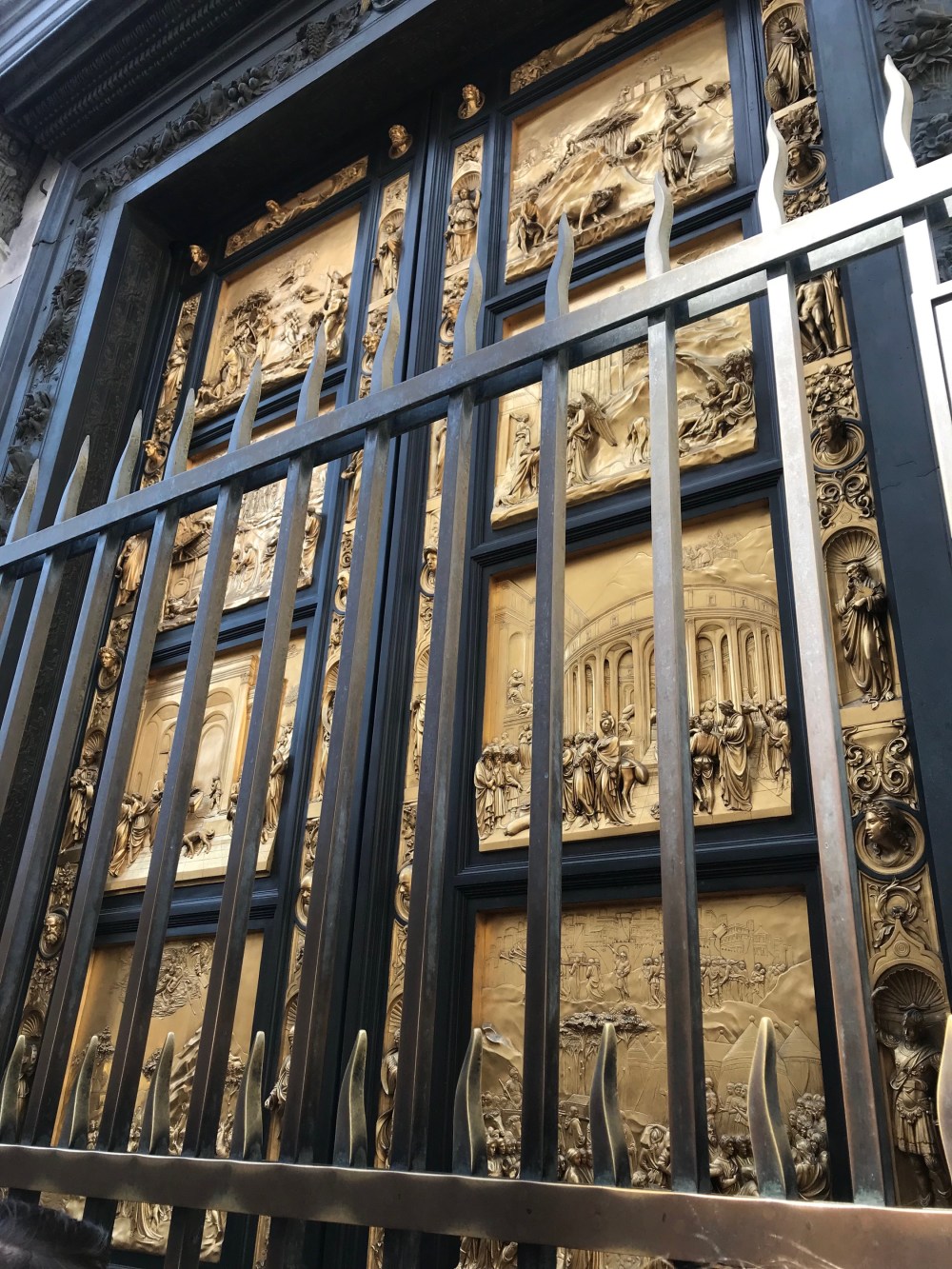 Ghiberti famous doors of the Duomo. Blocked off so idiot tourists don’t ruin a masterpiece. Just a fraction of the entire reliefs of Biblical stories.