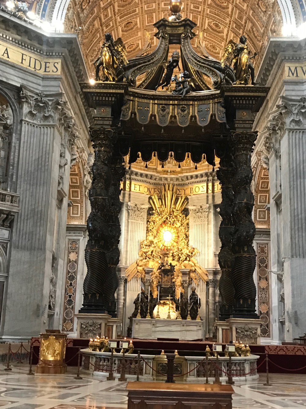 The Baldacchino in bronze done by Bernini considered as great a sculptor and architect as Michelangelo. Where ever you look in the Basilica art surrounds you. But there are no paintings because of the high humidity the church removed them and replaced with mosaics. They perfectly match the originals.